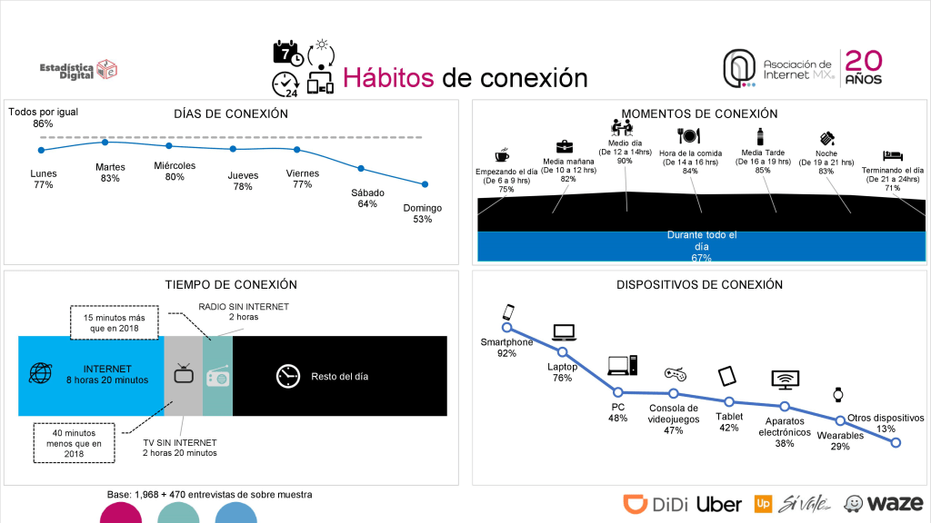 En los hábitos de conexión, se presentan los días de conexión desde lunes a domingo y se identifica al día martes con un porcentaje de 83 %, lo que indica que es el día con mas conexión. En los momentos de conexión, el momento con mayor porcentaje son durante el medio día, entre 12 a 14 hrs. Por otro lado Smartphone, suele ser el dispositivo en que existe mas conexión, con un porcentaje del 92%. Lo que indica que la sociedad utiliza mas el teléfono celular que cualquier otro aparto, por el mismo motivo de que este es mas pequeño y fácil de revisar.